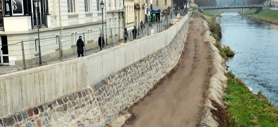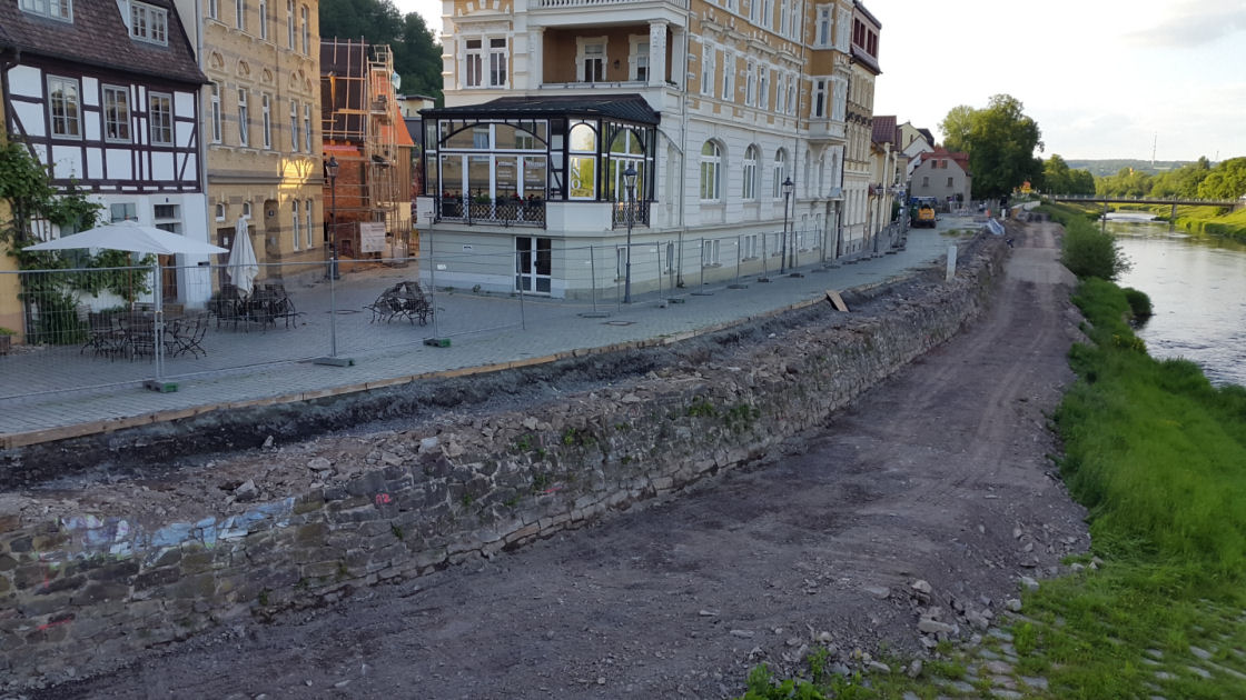 ruhten die Arbeiten an der neuen Schutzmauer, zwischen Untermhäuser- und Cubabrücke.