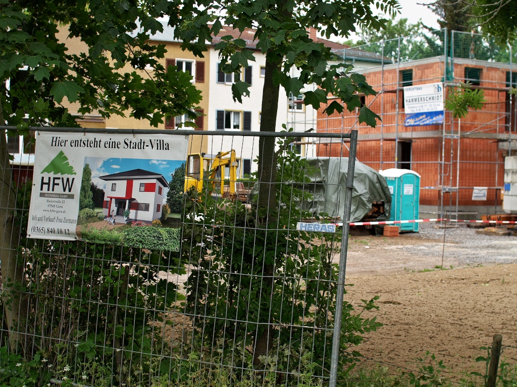 Das HFW-Schild mit der rot-weißen Villa ist für den geplanten Neubau auf dem noch leerstehenden Teil des Grundstücks.