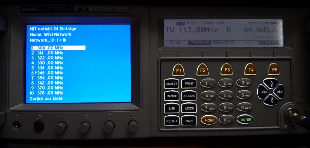 Das ist im linken Display die auf 113 MHz ausgelesene NIT. Sie hat 24 Einträge, von jedem habe ich die TS-ID und muß sie morgen noch von Hand den Sat-Transpondern (und damit der Programmbelegung) zuordnen. Interessant schonmal: Kanäle unter 300 MHz sind da gar nicht gelistet, obwohl sie verwendet werden. Und die Frequenz mit dem Sternchen davor ist die, auf der sich der gerade laufende Transportstrom als NIT-Eintrag wiederfindet.