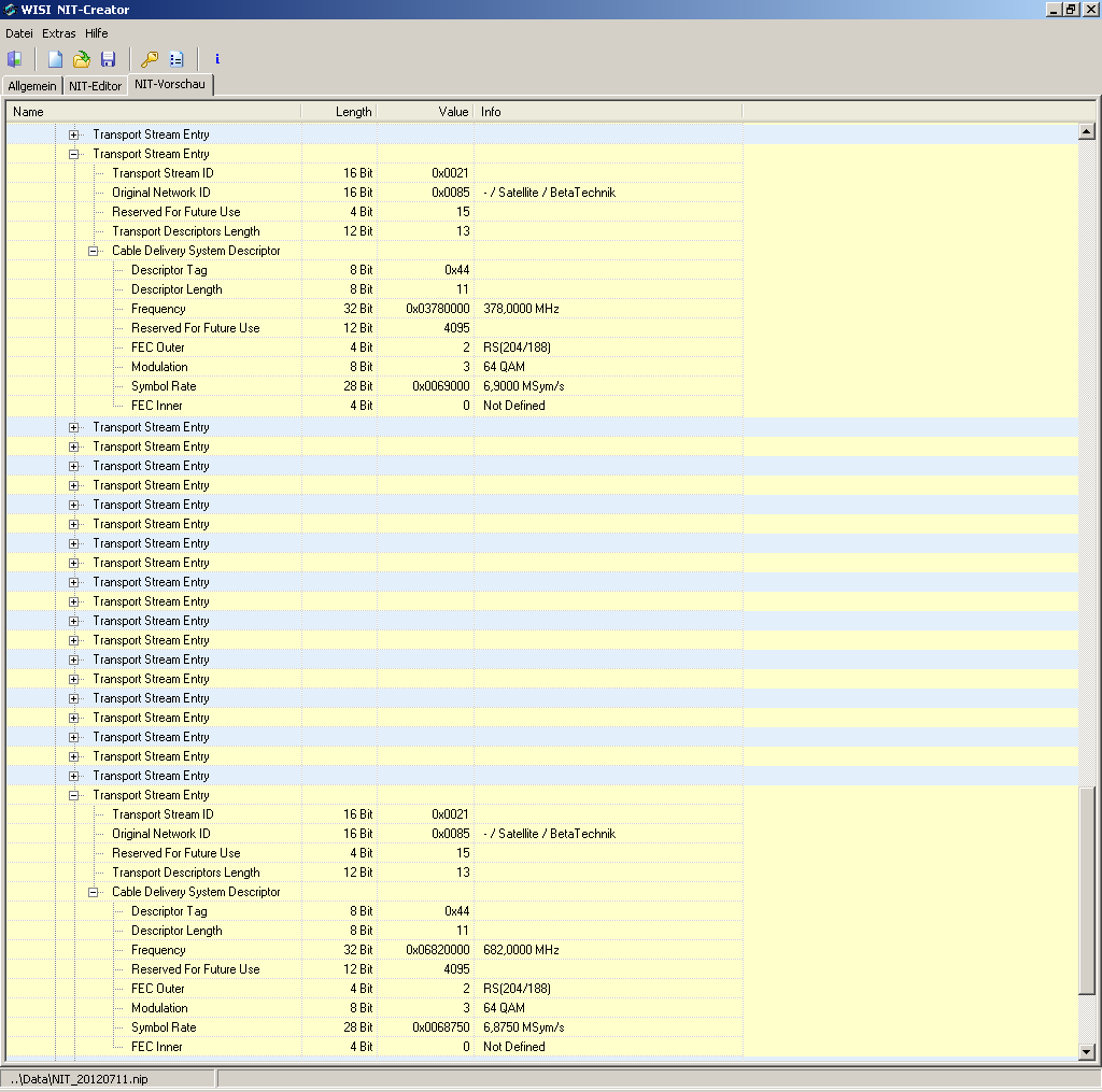 In der NIT steht die Transportstrom-ID 0x0021 (hexadezimal, entspricht 33 dezimal) also 2 mal drin: auf 378 MHz mit 64 QAM und 6900 MSymb/s sowie auf 682 MHz mit 64 QAM und 6875 MSymb/s. Ersteres ist auf der Neuanlage, zweiteres auf der Altanlage, die nicht verschrottet wurde, weil sie ja noch spielt (dafür kostet Tecosi auch keine 19 EUR im Monat...). Die Altanlage erkennt man an den 6875er Symbolraten, die kann nicht mit Stopfnullen auf 6900 auffüllen und gibt die Datenrate weiter, die von Astra/Hotbird kommt.