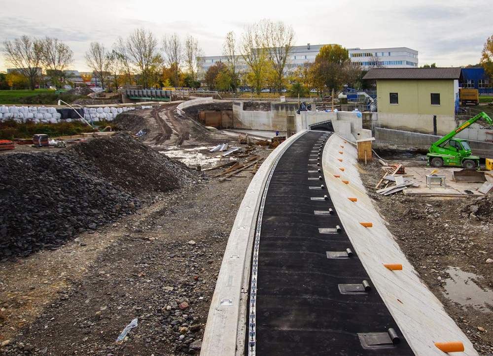 Die Verankerung und der Grundsockel für das neue Schlauchwehr steht.
