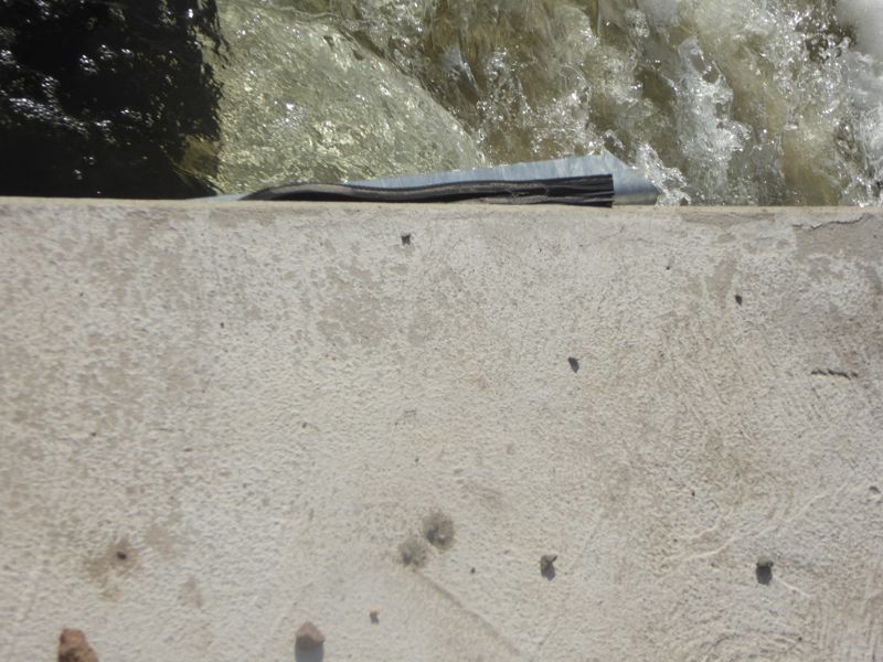 Welch eine Überraschung! Heute floss das Wasser über das neue Wehr. Von einem Schlauch habe ich nichts gesehen. Ist der schon drauf?