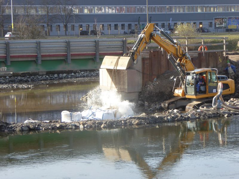 Also kein Probebetrieb. Vielmehr geht es im Moment noch nicht höher. Wenn der Damm bei der Behelfsbrücke geschlossen ist, kann der Mühlgraben wieder geflutet werden. Es fehlen nur geschätzte 20cm.