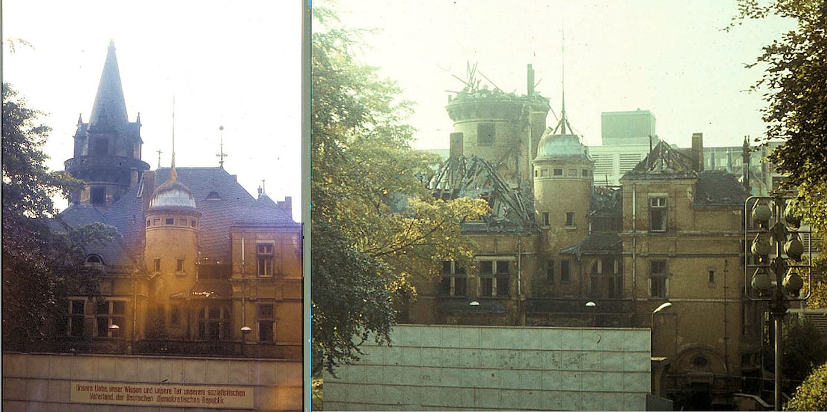 Bild links schon zum Abriss vorbereitet, rechts kam das Zündholz eher als die Abrisskolonne.