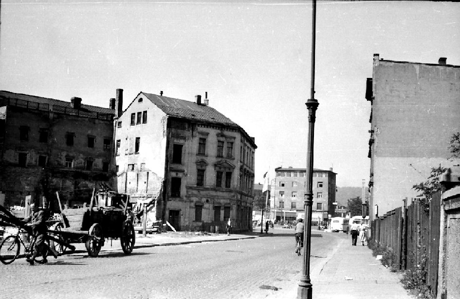 noch schnell von meinereiner der ehml. Roßplatz (seit 1949 Platz der Republik) war ja der damalige Verkehrs-Knotenpunkt für Busse und Bahnen, also konnte der Blick nur aus der Margaretenstraße sein, die total abgerissen wurde und dafür die Neubauten am Anna-Schneiderweg entstanden. Eine zeitlang exsistiert noch die verlängerte Margaretenstraße, diese führte am Mühlgraben entlang, zum eheml. Kindergarten (bis 1971 dann Kaufhalle Centra) und zum Weber´schen Haus (1975 abgerissen trotz Denkmalschutz)