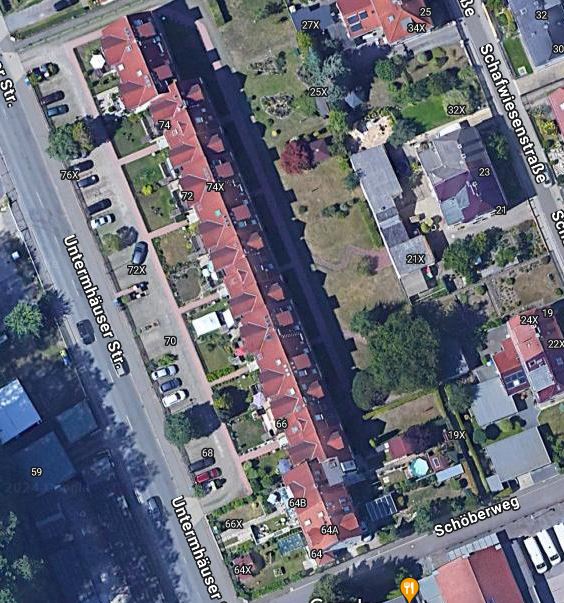 Könnten es sich um Häuser aus der Schafwiesensiedlung handeln? Dann würden sich auch die Gärten, wie im Vordergrund zu sehen, erklären lassen.