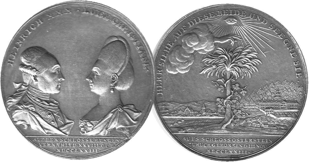 Zurückgekommen am 3.November 1773 wurde vermutlich noch einmal ein Fest gefeiert, zu welchem auch diese Medaille als Erinnerung an geladene Gäste verschenkt oder anderweitig verausgabt wurde. Ein interessantes Abbild der damaligen Kleidungs- und Perückenmode, auf der Rückseite Schloss Osterstein, die Stadt Gera und Alt-Untermhaus vom Weinberg aus gesehen. Die Palme mit dem umrankenden Weinstock ist vermutlich in Anlehnung an die Dichtung des "Hohenliedes" über die Schönheit der Geliebten »Wie schön bist du und wie reizend, du Liebe voller Wonnen! Wie eine Palme ist dein Wuchs; deine Brüste sind wie Trauben ..... .« symbolisiert worden. Weiterhin sieht man das strahlende Auge der Dreifaltigkeit und die alles segnende Hand aus den Wolken.