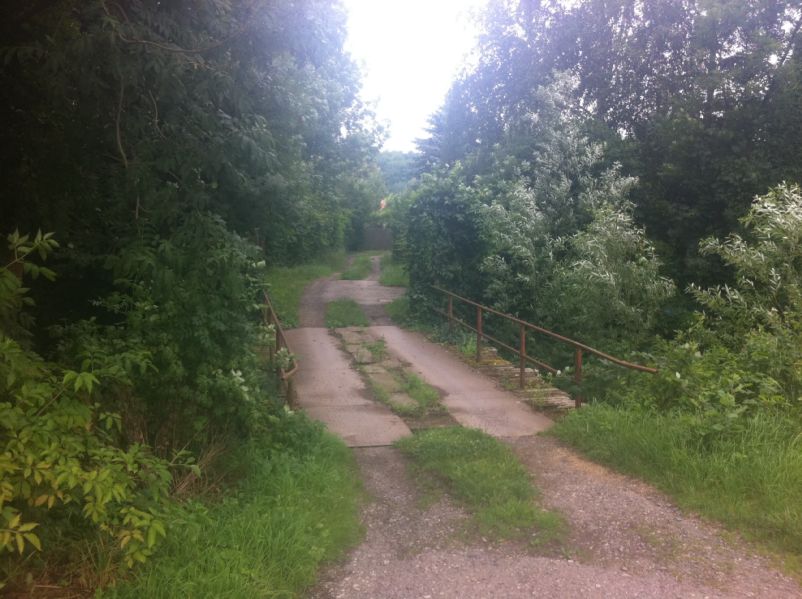 Die Holzbrücke über den Mühlgraben ist marode, doch noch erhalten. Um sie wenigstens für PKWs der Gartenbesitzer zu ertüchtigen, wurde sie mit Blechplatten verstärkt.