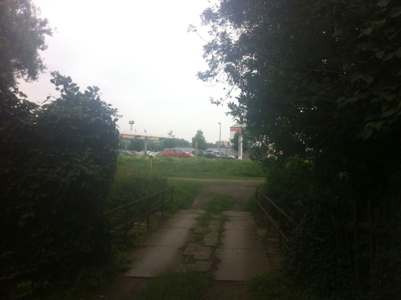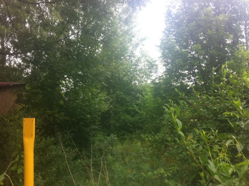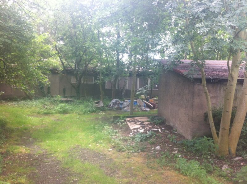 Wenn man genau durch das Gebüsch schaut, erkennt man noch ein Gebäude, welches zum Schulgarten gehörte. Dieses Bild zeigt den Anblick aus der Sicht eines Autofahrers, der die Leibnizstraße entlang fährt.