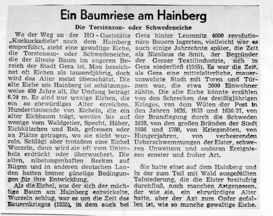 Als Randnotiz sei angefügt, dass dereinst die Gaststätte "Kuckucksdiele" den Namen "Zur Torstensson-Eiche" trug.