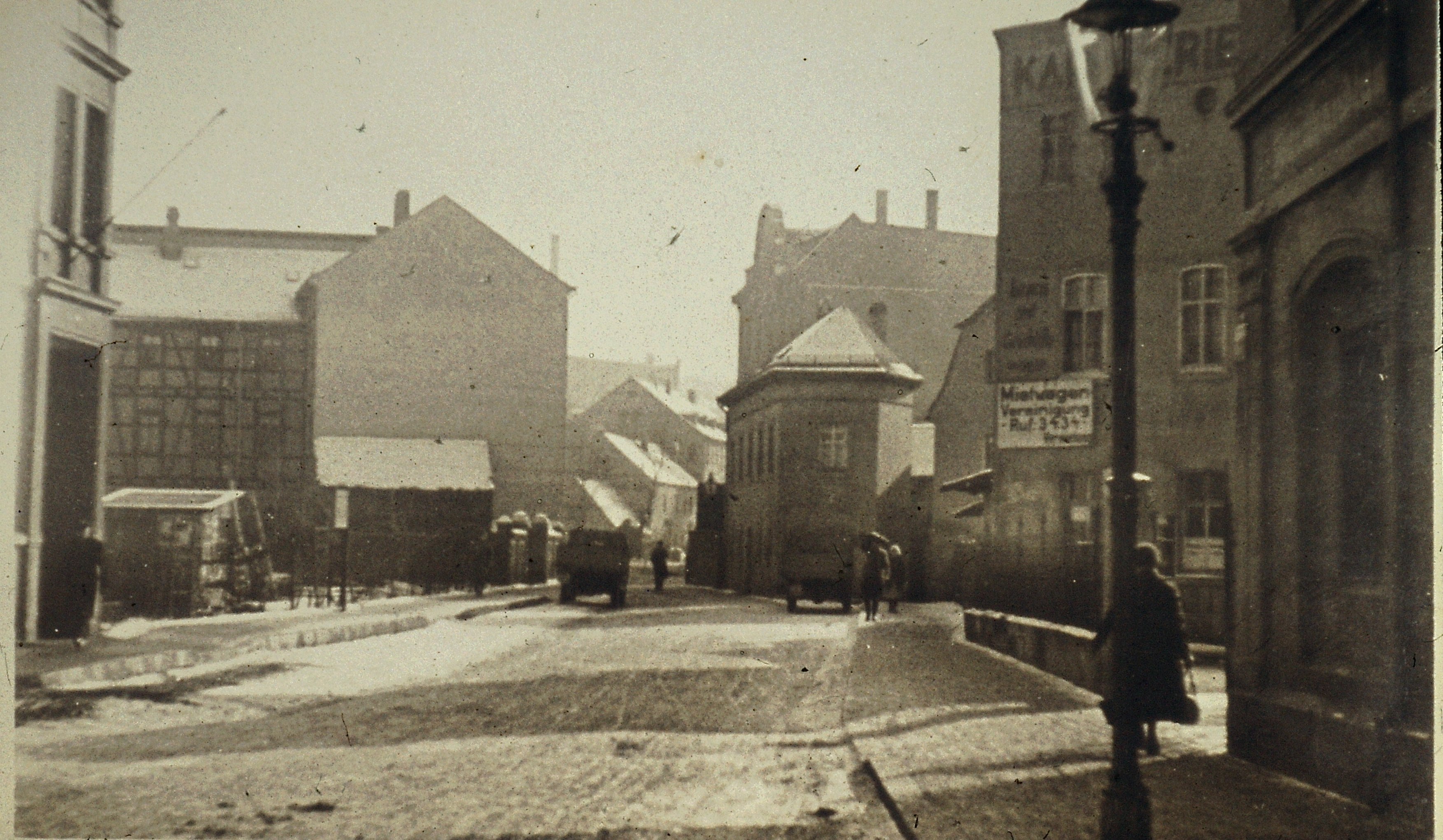 Das Foto stammt aus dem fotografischen Nachlass von Georg Kemnitz. Es ist beschriftet und gibt den Ort der Aufnahme an. Da ich diese Stelle aus eigener Erinnerung nicht mehr kenne, habe ich im Stadtplan v. Stiefelhagen nachgeschaut. Auf dem Foto dürfte es keine Mühlgrabenbrücke geben, wenn die Fotobeschriftung korrekt ist. Vielleicht hat jemand noch eine Idee, das Foto zeigt Zentrumsnähe.