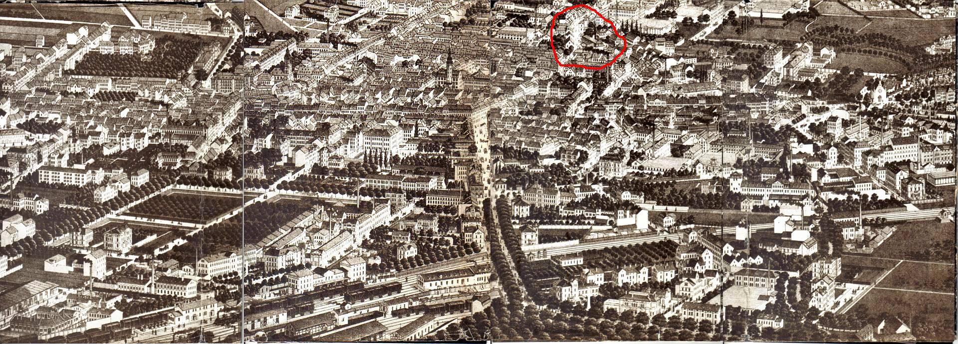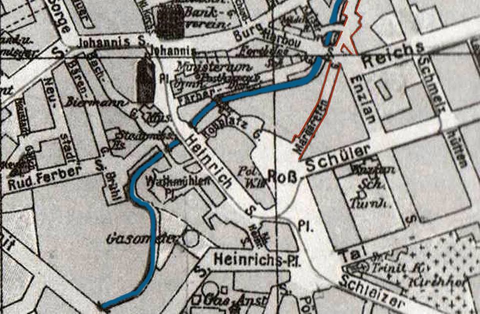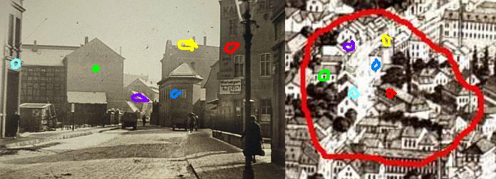 Asche, das kann nicht passen. Das ist doch nie und nimmer die Mühlengasse. Ich kenne die noch aus meiner Kindheit, die war deutlich schmaler und hatte nicht solch breite Gehwege. Ich glaube nicht, dass du von einer Lithographie aus den 1870er Jahren auf die Zeit 70 oder 80 Jahre später schließen kannst.