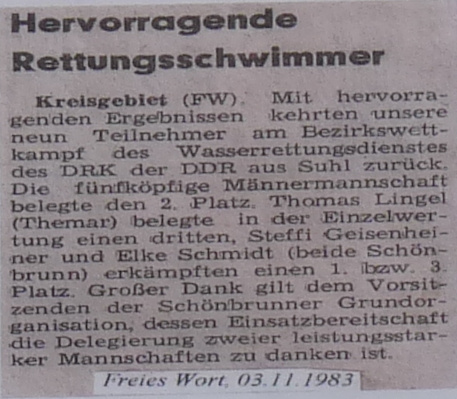 Der Mann baute binnen kürzester Zeit eine Rettungsschwimmergruppe in diesem Ort auf. Kein Kind, das da nicht alsbald perfekt schwimmen konnte. Der harte Kern begann dann, die einschlägigen Wettkämpfe zu gewinnen und dem Ort so einen Namen auf diesem Gebiet zu setzen, zuerst im Bezirk Suhl, dann wohl auch darüber hinaus auf DDR-Ebene.