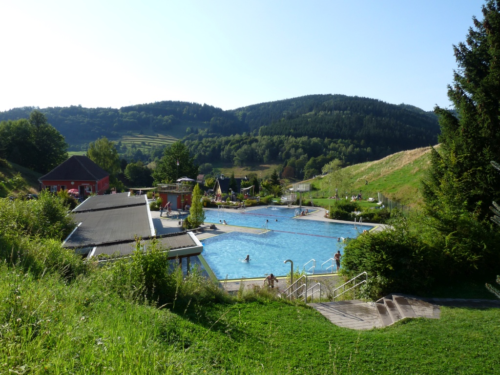 Irgendwann hatte mein Vater meine Mutter kennengelernt und damit Kontakt zu deren Heimat im Thüringer Wald bekommen. Dort war in den 70er Jahren auf Betreiben der Einwohner ein stattliches Schwimmbad mit 50-Meter-Becken in den Fels eines kleinen Seitentales gehauen worden, idyllisch gelegen zwischen den sanften Rücken einstiger "Handtuch"-Felder, die nun Wiesen waren, und von einem kalten klaren Bach durchströmt. Das Bad wurde irgendwie halbwegs "wild" genutzt, was auf Dauer nicht zu verantworten war, zumal man ein damals touristisch gut besuchter Ort war und auch den Touristen dieses Bad sicher zugänglich machen wollte.