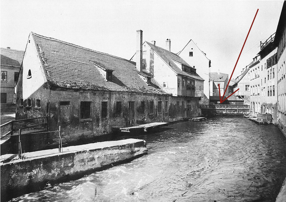 Der Fotograf stand in der Keysergasse neben dem Seydelschen Haus, mit Blick zur Mühlgrabenbrücke,