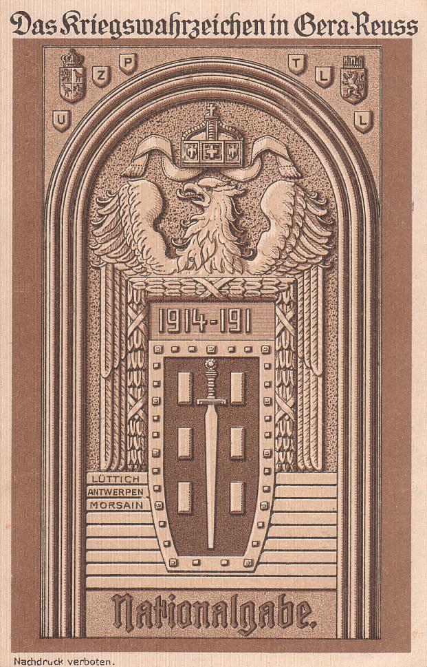05.März 1916 - Am Rathausportal wird mit der Nagelung eines Kriegswahrzeichens begonnen. Es stellt ein Schild mit Reichsadler und Reichskrone dar. Spender können dort eiserne, versilberte oder vergoldete Nägel (im Rahmen einer Spende zwischen 0,50 und 300 Mark) einschlagen. Die Nagelung erbringt in der Folgezeit 75.982 Mark... (Klaus Brodale/ Heidrun Friedemann, Das war das 20.Jahrhundert in Gera, 2002, S.20)