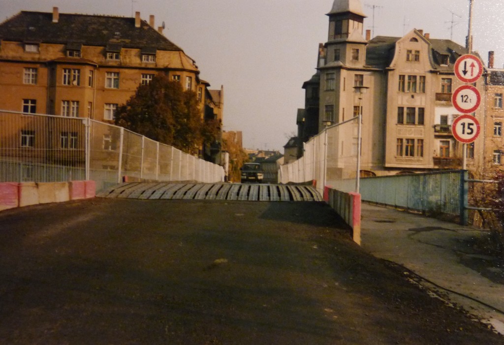 Nun erst konnte man die alte Cubabrücke abreißen und neu bauen. Der Verkehr mußte sich dann mit Ampelregelung am alten Brückenkopf einbahnmäßig stadtauswärts über den Kupferhammer / Conradstraße quälen. Noch im Sommer 1993 stand die alte Cubabrücke faktisch so, wie sie war. Das Provisorium blieb wohl mindestens bis Frühjahr 1995 bestehen, wenn die Aufschrift hinten auf dem Foto nicht falsch ist.