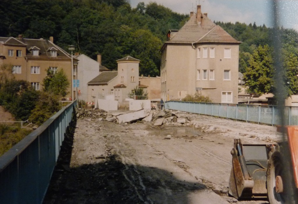 Für die, die damals noch nicht in Untermhaus oder überhaupt nicht in Gera lebten: die Cubabrücke bestand, wie man im Herbst 1992 feststellte, faktisch nur noch aus Sand. Die Stabilität war von heute auf morgen nicht mehr gegeben (...), also Vollsperrung und Umleitung über Timbuktu oder so. Jedenfalls so, daß es nicht akzeptabel war. Ich glaube, entweder Bad Köstritz (!) oder Klinikum - Frankenthal (!). Ging aber natürlich gar nicht anders. Soweit ich mich erinnere, machte man dann die Brücke an der Untermhäuser Kirche wieder auf, doch die hielt das auch nicht aus. Also baute man auf die vorhandene Brücke kurzfristig eine Stahl-Behelfsbrücke der Armee obendrauf. Diese Konstruktion stützte sich nur direkt auf den alten Pfeilern ab:
