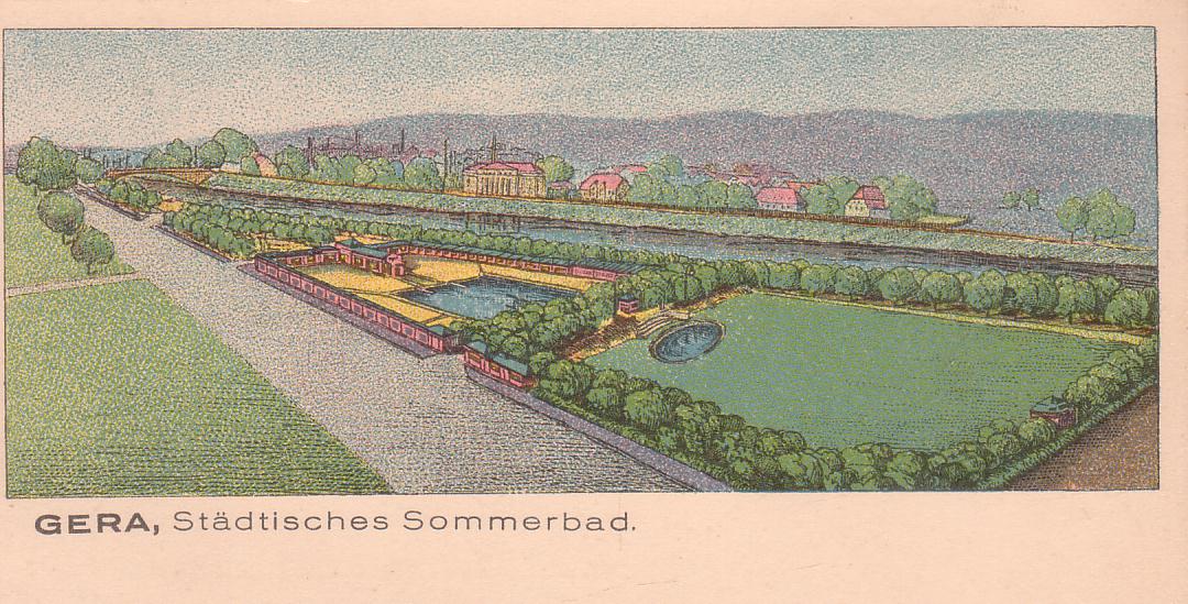 [i]20.Juli 1924 - Auf den Hofwiesen wird das städtische Sommerbad durch "Fräulein Hesselbarth mit einem kühnen Sprung vom höchsten Sprungbrett bei allerdings kühlen 16 Grad Wassertemperatur" eingeweiht. Alle Geraer Schwimmvereine veranstalten bei schönstem Wetter ein Kunst- und Schauschwimmen. "In seiner Ansprache geht Oberbaurat Luthardt darauf ein, dass mit dem Sommerbad eine großzügige Aufteilung des Geländes zwischen Heinrichsbrücke und Adelheidbrücke erreicht wurde. Das Bad ist ein erster Teil zur Schaffung einer großen Grünanlage, die sich zu einer grünen 'Lunge der Stadt' entwickeln soll. Bis zu diesem Zeitpunkt hatte der Bau rund 200.000 Goldmark verschlungen... (Klaus Brodale/ Heidrun Friedemann, Das war das 20.Jahrhundert in Gera, 2002, S.28)