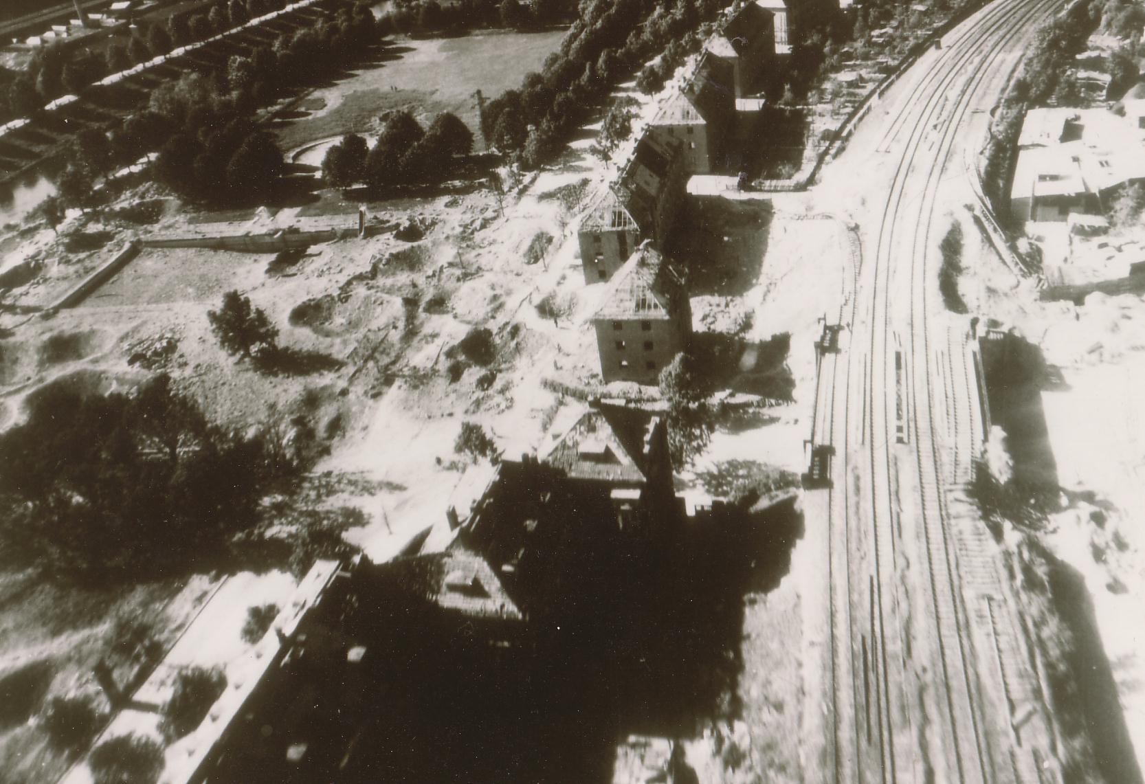 Die Luftaufnahme zeigt rechts die Brücke über die De-Smit-Straße Einmündung Straße am Sommerbad sowie die Zerstörungen am Bad und der Sommerbadstraße.