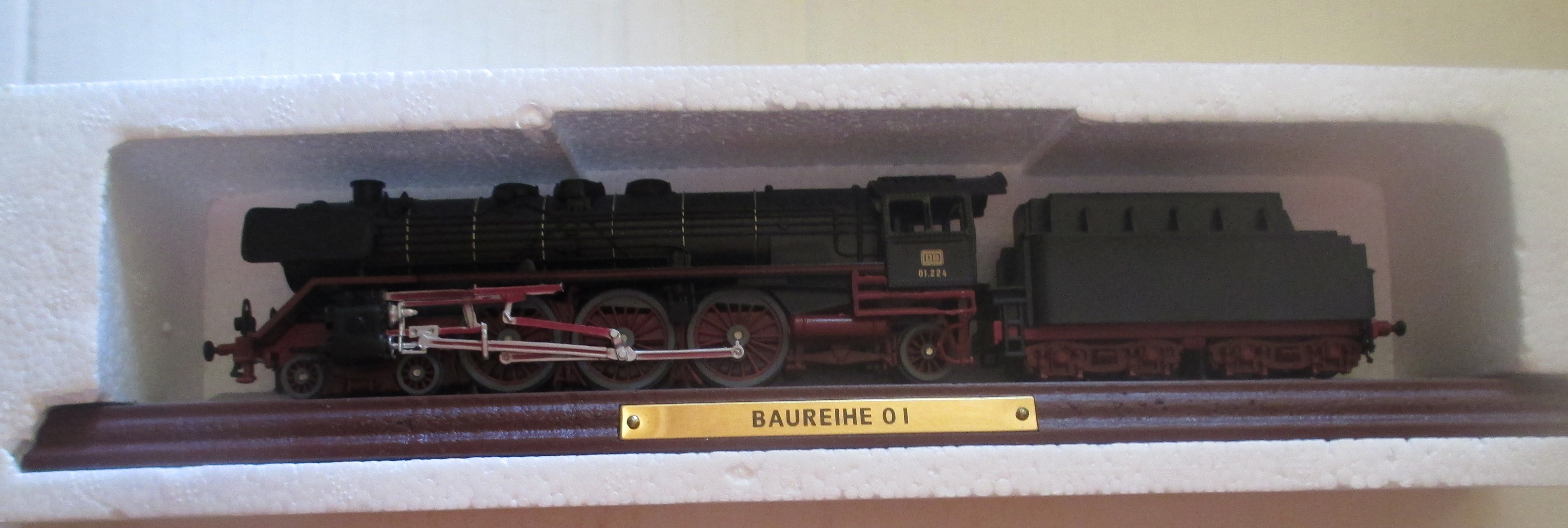 Das Styropor und die Folie der Verpackung sind etwas angeschmuddelt, man kann das aber natürlich auch ohne die Verpackung ins Regal stellen. Die Lok wurde aus Plastik gefertigt.