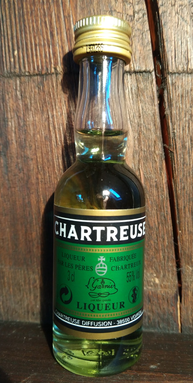 Dann schmeiße ich zunächst mal eine Probierflasche Chartreuse verte auf den Markt. 3cl Inhalt, 55%. Das Original von den alten Karthäusermönchen unten bei Grenoble nach alter geheimer Rezeptur. Bekanntlich verlängert das Zeug das Leben.