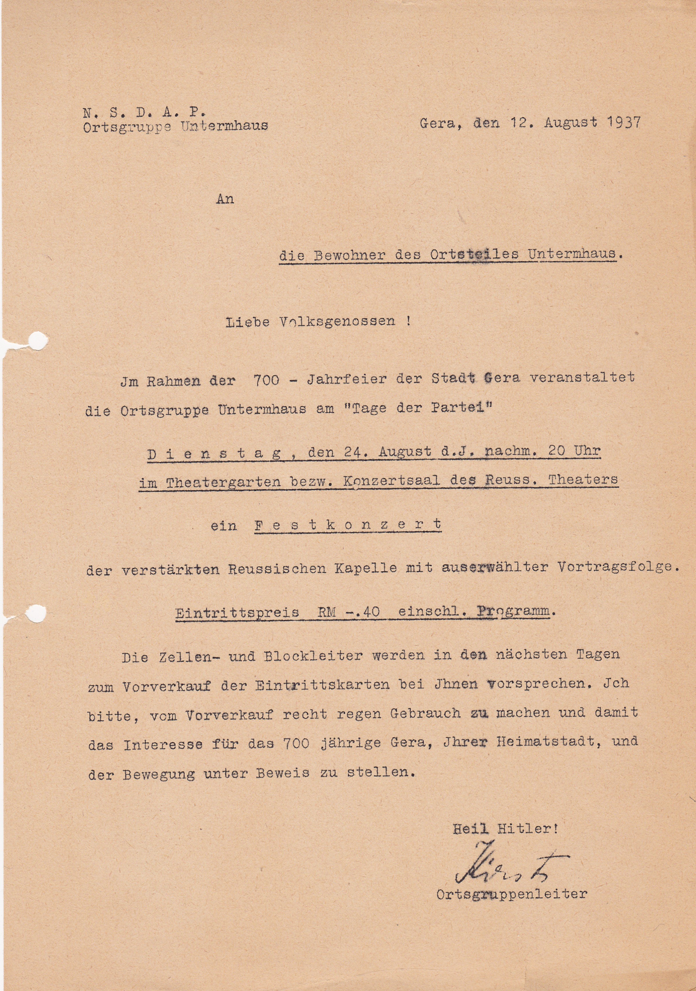 Es handelt sich um ein Schreiben der NSDAP-Ortsgruppe Untermhaus und richtet sich an die Bewohner des Ortsteiles. Angekündigt wird ein Festkonzert anlässlich der 700-Jahrfeier Gera`s.