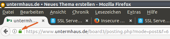Auf dem Server habe ich ein geheimes Zertifikat hinterlegt, mit dem er sich gegenüber Eurem Browser ausweisen kann. Diese beiden (Browser und Server) kungeln nun automatisch aus, wie die Verschlüsselung erfolgen wird, so dass Ihr Euch theoretisch um nichts kümmern müsst. Das Ganze sollte an diesem kleinen untermhausgrünen Schluss neben der Adresse zu sehen sein.