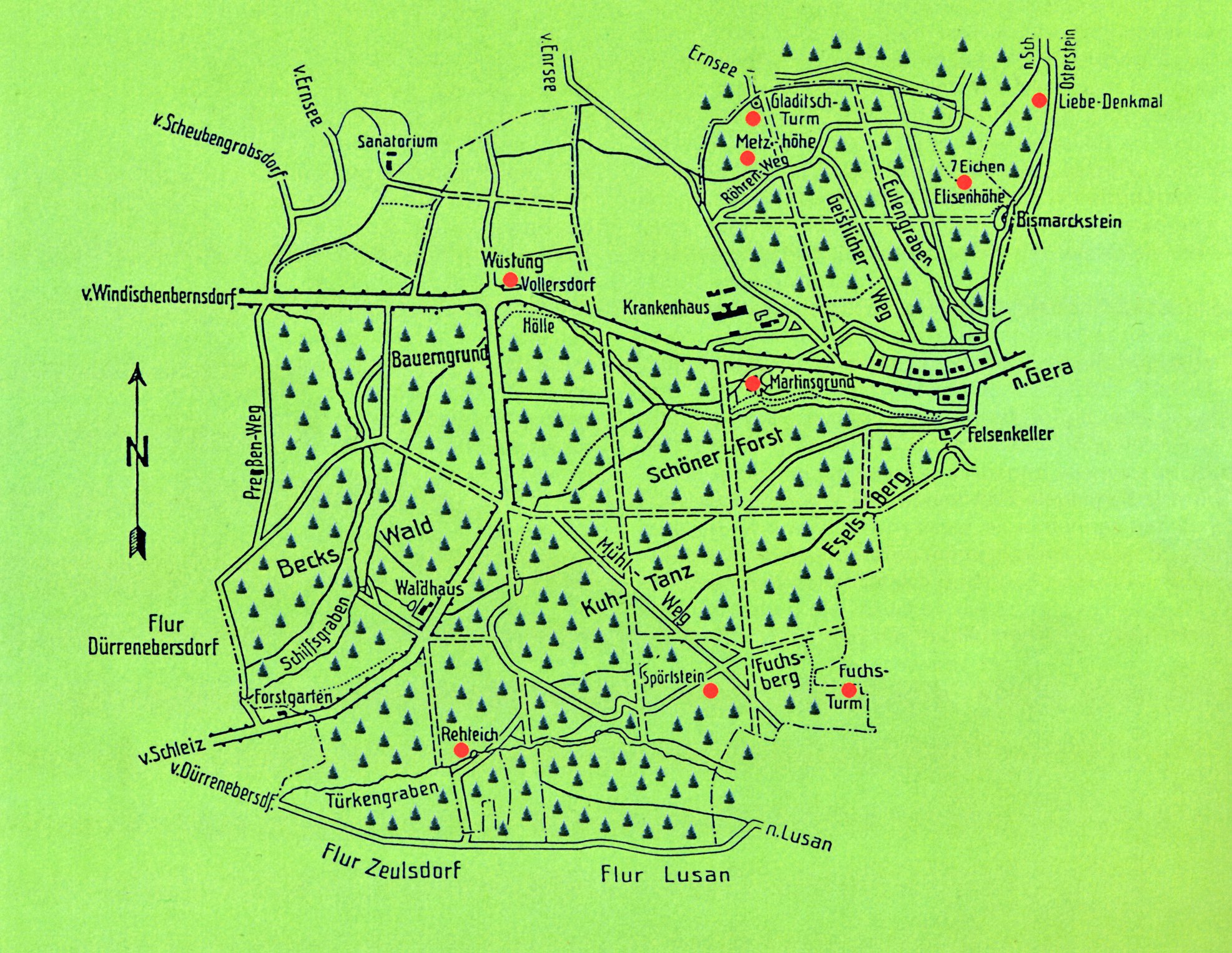 Diese Karte des Stadtwaldes hat Frank Ruediger um 2008 auf der Grundlage eines Planes aus Kretschmers „Geschichte der Stadt Gera“ erstellt.