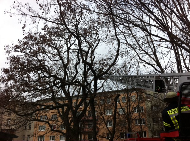 Zu einem ungewöhnlichen Feuerwehreinsatz kam es heute in der Schülerstraße. Eine Krähe hatte sich im Geäst eines Baumes im Hinterhof verfangen. Die Feuerwehrleute konnten die Drehleiter nicht sofort zum Ort des Unglücks schwenken, weil dickes Geäst im Weg war.