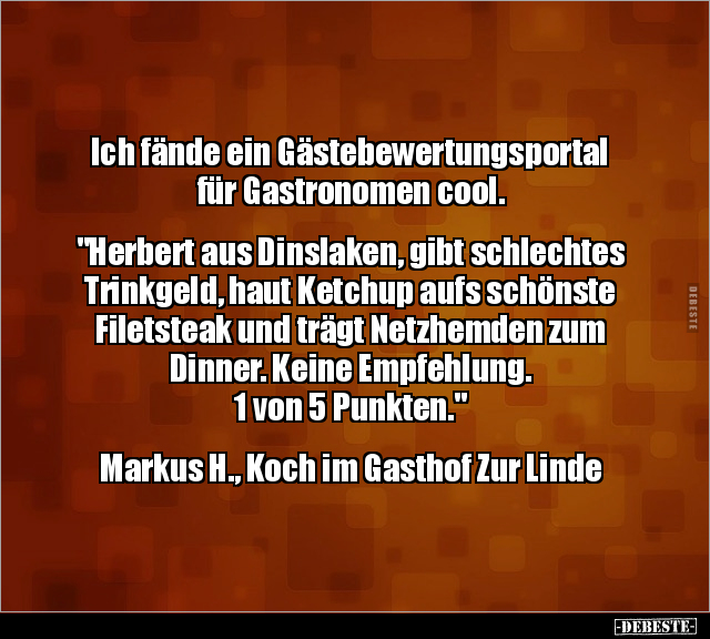 Fragt der Ober den Gast: "Und, hat es Ihnen geschmeckt?" Gast: "Ich habe schon besser gegessen." Darauf der Ober: "Aber nicht bei uns."