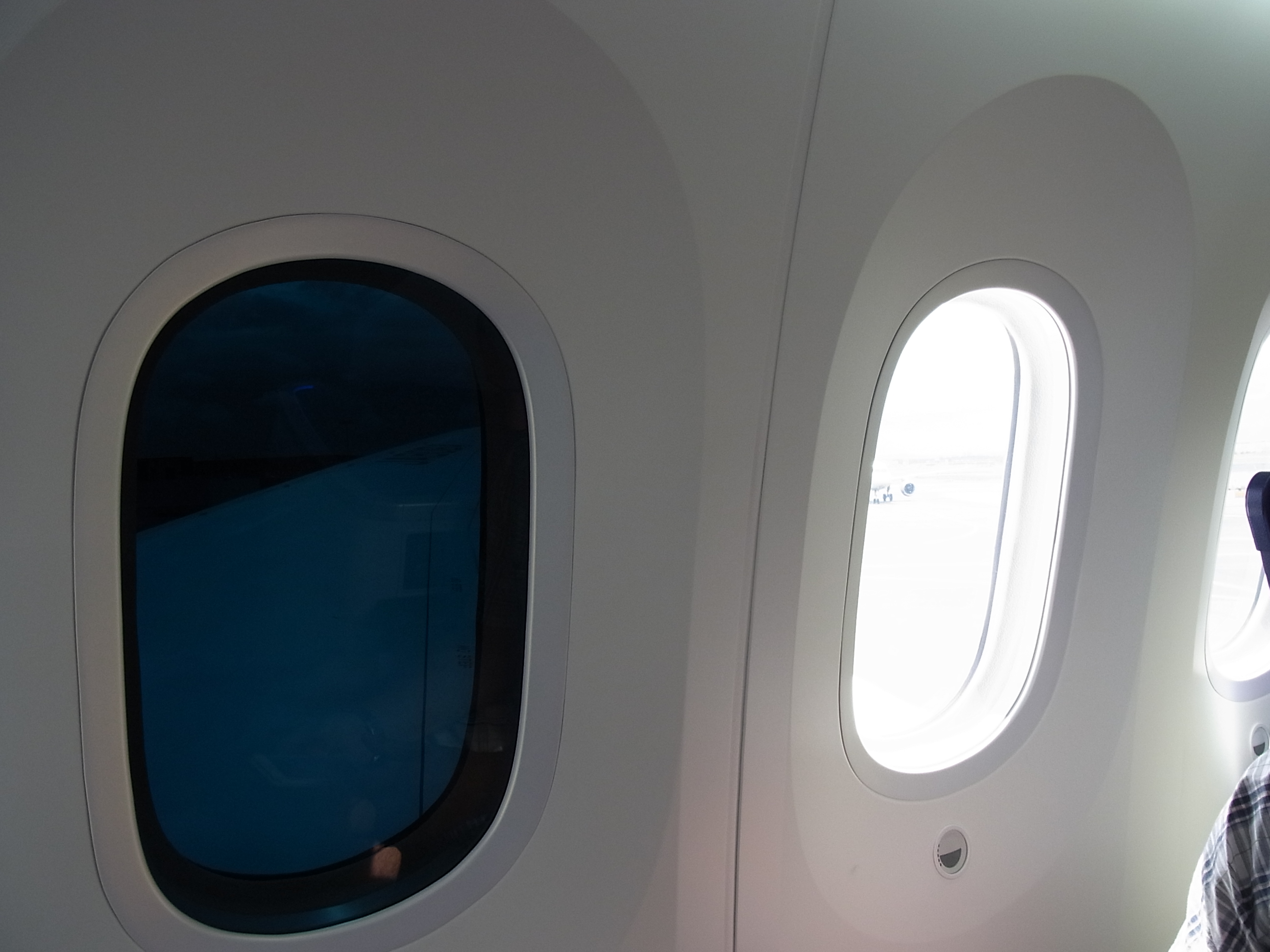 Zum Dreamliner kann ich ein paar aktuelle Fotos beisteuern. Positiv aufgefallen ist die Existenz eines Fensters in der Toilette, dieses gibt den Blick auf das Triebwerk frei. Durch die Verbundwerkstoffe sind die Flügel ziemlich elastisch und biegen sich deutlich nach oben während des Betriebes. Überhaupt sind die Fenster schön groß, die Transparenz wird elektrisch gesteuert (Abdunklung und besonders die Aufhellung dauern aber ein paar Minuten). Geräuschmäßig ist die Maschine aber nicht besser als die anderen, da könnte der 350 noch ordentlich punkten. Die Sitzeinheiten sind sehr bequem und erlauben eine vollständig flache Horizontale. Etwas unerwartet kam der Reboot während des Landeanfluges, aber die Bedenken waren letztendlich unbegründet.