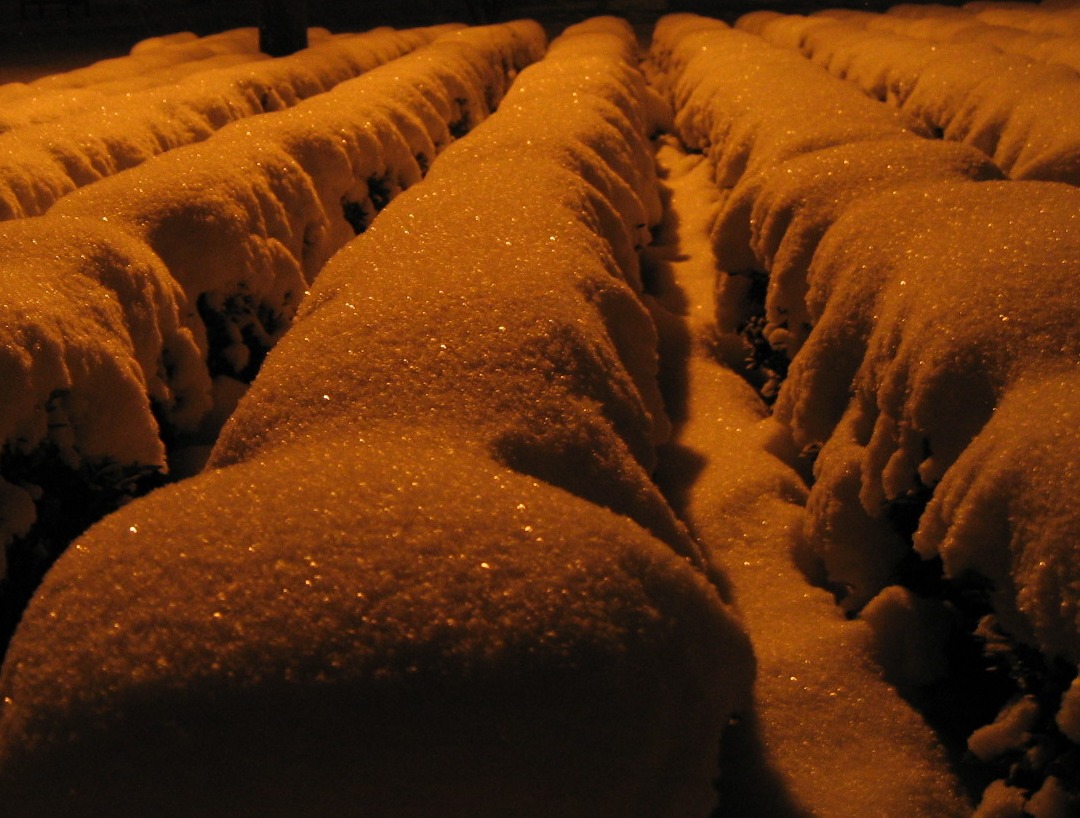 Ist das vielleicht ein Weinberg im Schnee bei Dunkelheit?