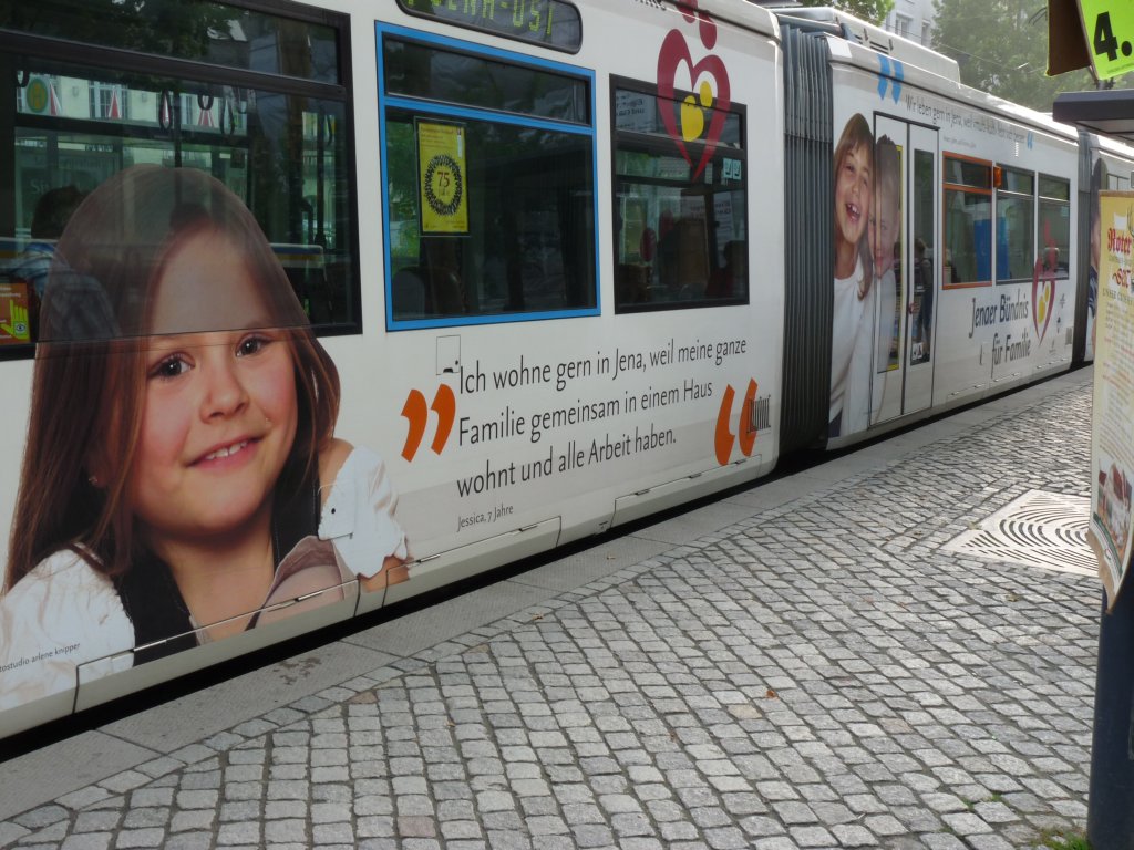 Die Straßenbahn fährt schon seit Jahren so herum. Drinnen stehen dann so Parolen an der Wand wie "Jena ist toll, weil der FCC so ein schönes Stadion hat" oder "Ich bin sehr froh, ich bin auf Zack, dank meiner schönen Jena-Stadt." Niemals textet ein Kind so, "auf Zack" stammt von der Oma, definitiv. Hier kannst Du Dir den Müll direkt an der Quelle runterladen. Diese Aufsteller stehen dann in den Jenaer Firmen herum, zum Hohn für alle, die da im letzten Loch hausen.