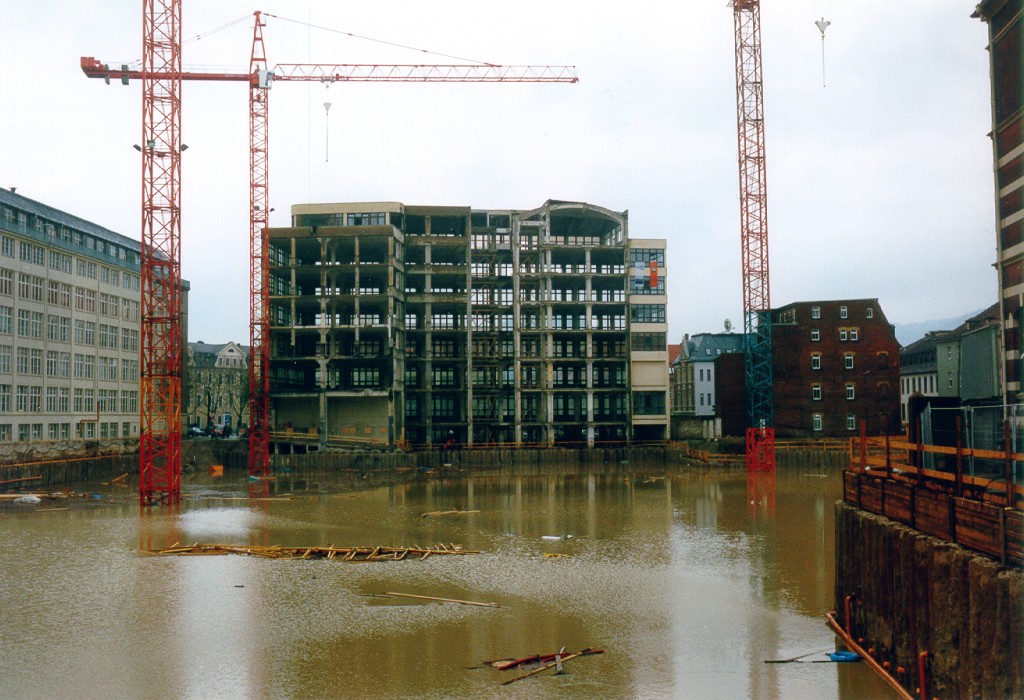 Und weil ich den Thread ohnehin schon topic-technisch geschrottet habe (die Vorlage hast Du aber geliefert ;) ) schicke ich gleich mal paar Fotos von 1994 hinterher. Da trat nicht nur die Saale über die Ufer, sondern auch die Leutra und floß - ganz wie früher, als man sie zweimal wöchentlich zur Straßenreinigung (!) durch Jenas Gassen fließen ließ - freudig dorthin, wo es am tiefsten war. Und das war damals die frisch ausgehobene Baugrube der Goethegalerie, die sich über Nacht in ein herzallerliebstes Schwimmbad verwandelte. Dort ist heute der tegut-Markt drin. Damals trug der Uniturm auch noch Längsstreifen und wirkte deshalb schlank und nicht pummelig.