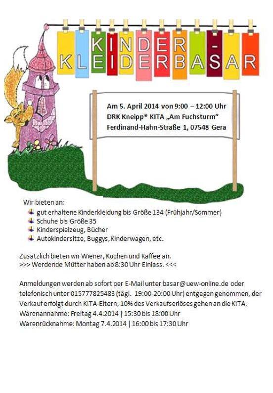 es ist mal wieder soweit! am 05.April - unser Kita-Basar! und wer keine Kinder bis Größe 134 mehr zu Hause hat (man kann sein Zeug auch dort verkaufen!), kann sich zumindest für das Kaffeetrinken frischen, selbstgebackenen Kuchen für 50 cent das Stück holen!!!