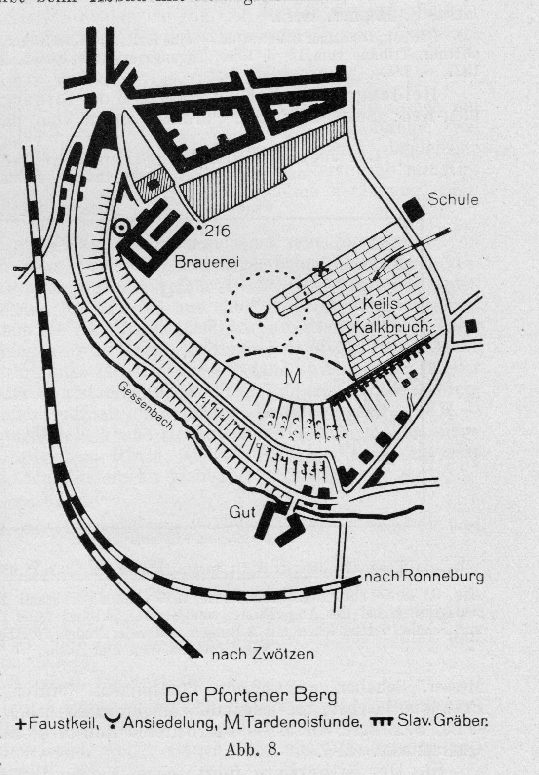 Zitat: Auch auf dem Gipfelbereich des Pfortners Berges waren vorher Menschen ansässig. Man fand altsteinzeitliche Steingeräte. Auf der Nordseite wurde ein Faustkeil gefunden, der die These bestätigt. Es wurden auch noch weitere Funde geborgen. Die Anhöhe ist durch einen später angelegten Steinbruch nicht mehr fündig