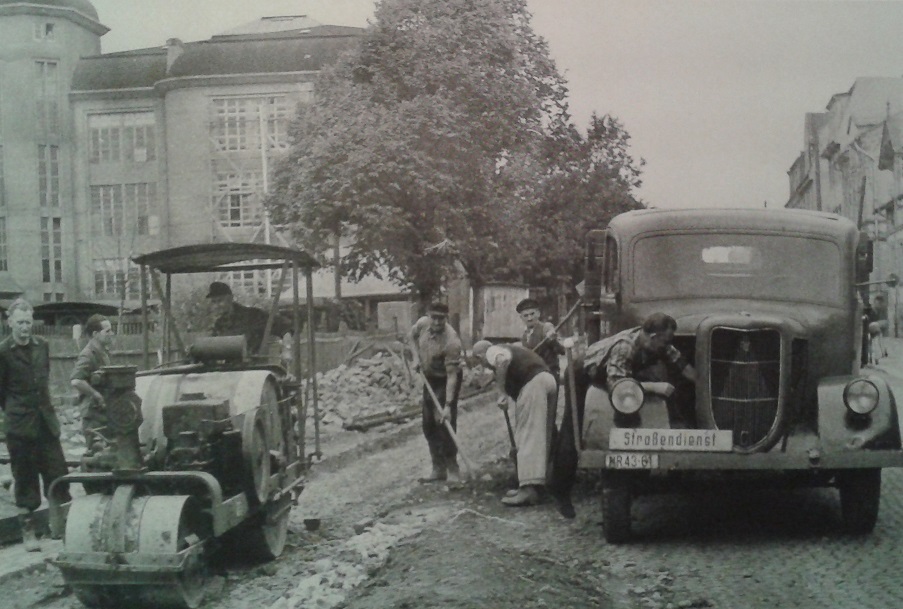 Anhand der Fahrzeuge und der Autonummer könnte das Ende der Fünfziger, Anfang Sechziger sein. Die Gleise werden noch gelegt, kein Wunder, dass sie nicht zu sehen sind.