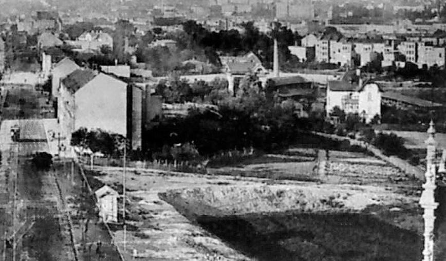 Die Rückseiten der Häuserreihe am rechten Postkartenrand gehören zur Wiesestraße.