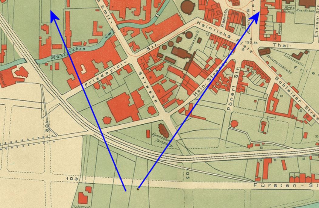 das wäre mein Blickwinkel, obwohl auf der alten Karte manche Häuser noch nicht stehen, oder schon wieder weg sind.