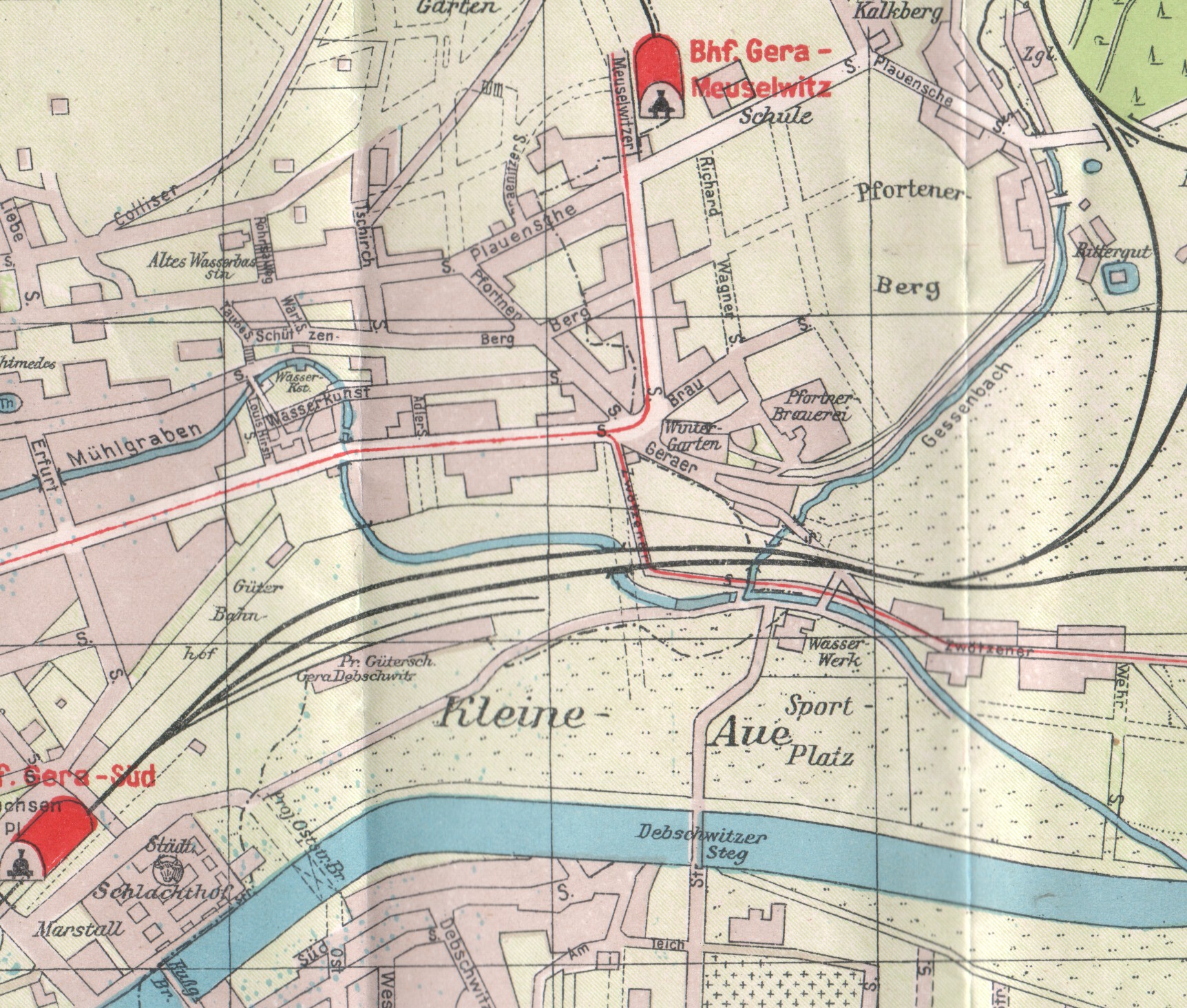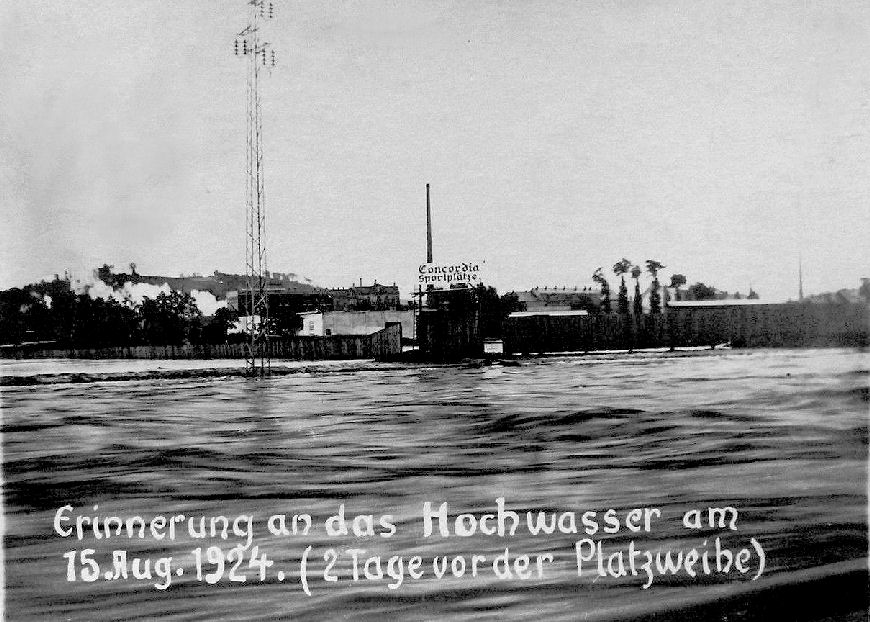 Der Verein nannte sich erst Fussballklub Concordia, ab 1927 dann Sportverein Concordia. Das Vereinsgebäude, welches der clarino hier hat absaufen lassen, stand in etwa dort, wo sich heute das Stadion am Steg befindet, die offizielle Adresse der Concordia lautete auch "Am Elstersteg". Auf dem Stadtplanausschnitt sehen wir das Sportplatzgelände. Im Hintergrund befand sich die Riebeck-Brauerei.