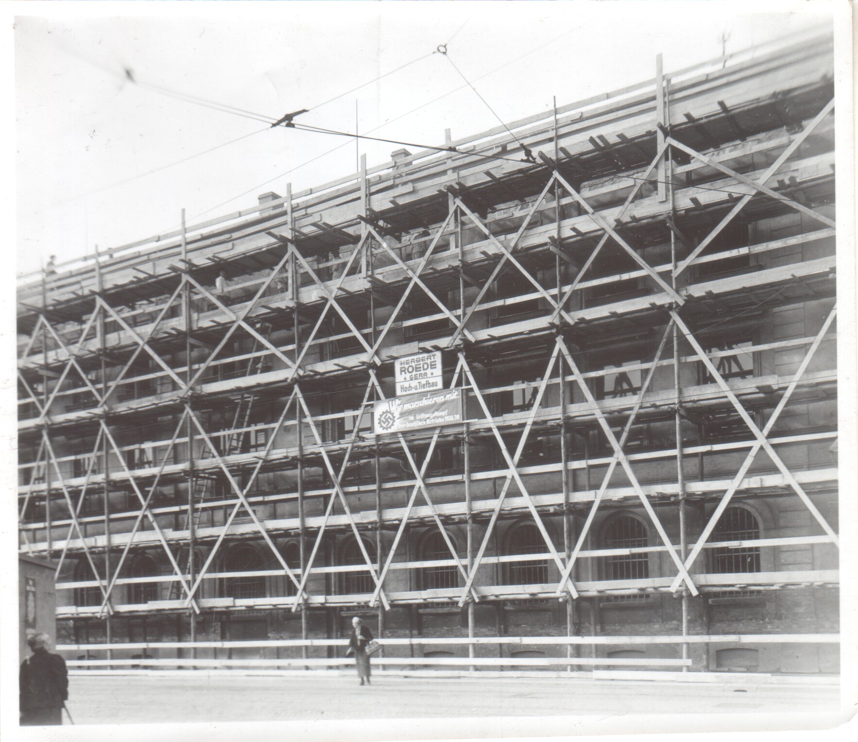Also, welches Gebäude versteckt sich hinter dem Gerüst, in welcher Straße war es zu finden, und wen oder was beherbergte es (Nutzung zu DDR-Zeiten lasse ich gelten)?