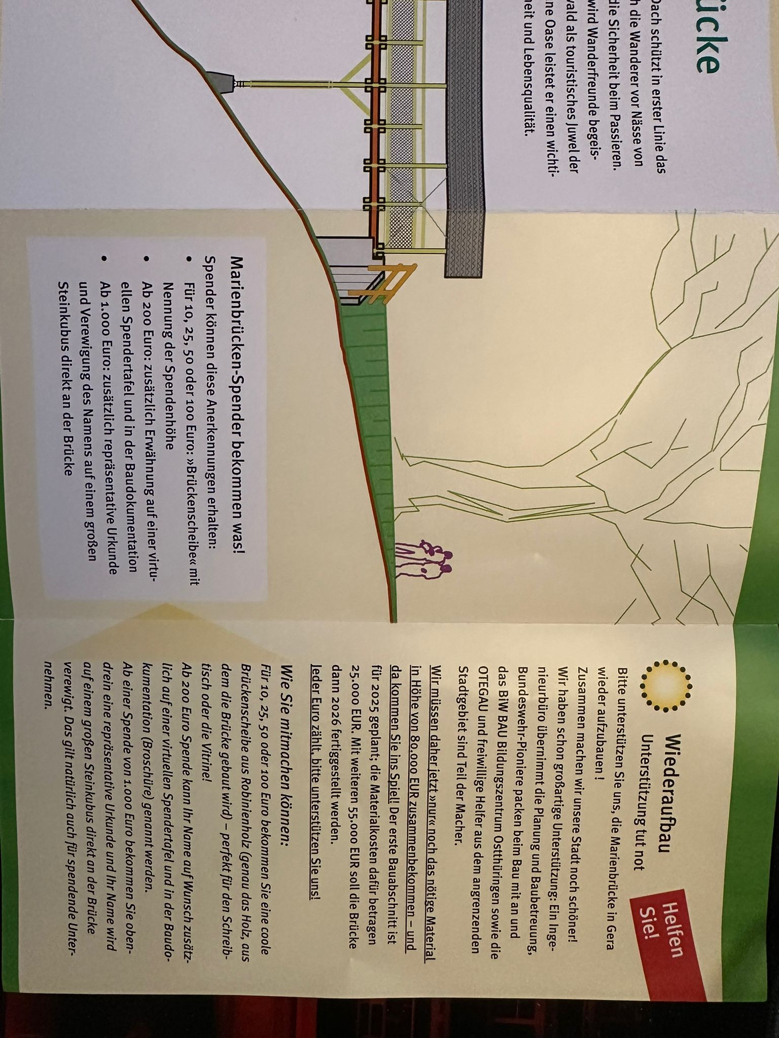 Der Neubau der Marienbrücke nimmt Gestalt an. Es existiert ein Spendenkonto und sogar schon ein Modell. Ist also keine Vision mehr. Den Flyer hab ich als Fotos geschickt bekommen. Würde gerne ein Original nehmen, wenn jemand eins übrig hat oder weiß, wo die ausliegen.
