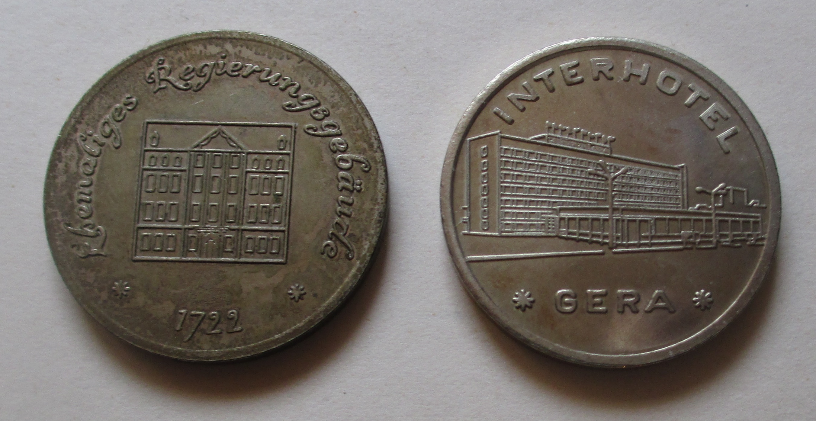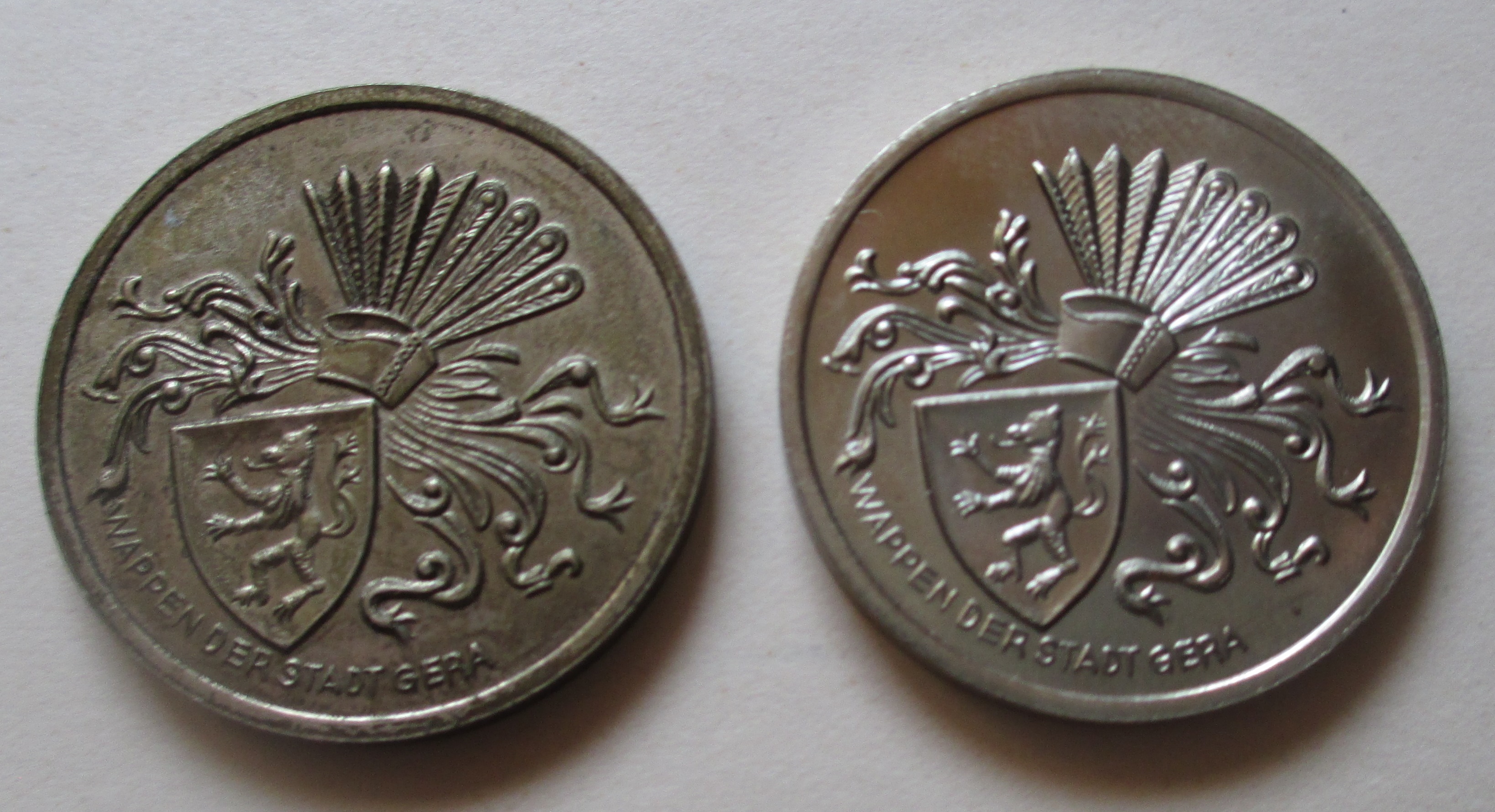 Die Medaillen haben einen durchmesser von ca. 35 mm und entstanden in Hettstedt. Beide Rückseiten zeigen das Wappen der Stadt Gera, vorderseitig wie zu sehen verschiedene Motive.