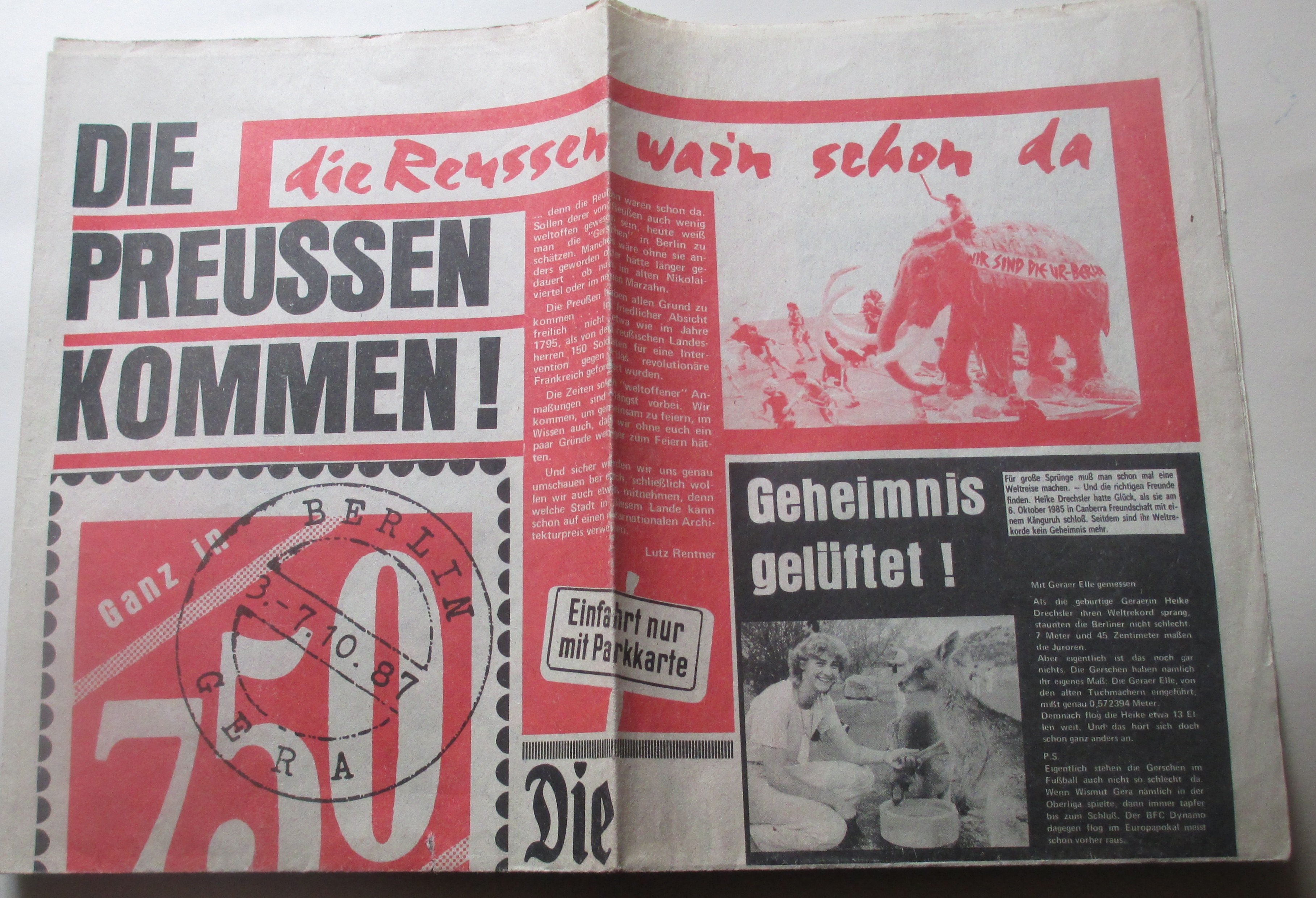 Zeitung mit 4 Seiten, humorige Betrachtung der 750 Jahrfeier von Gera und Berlin, recht seltenes Stück.