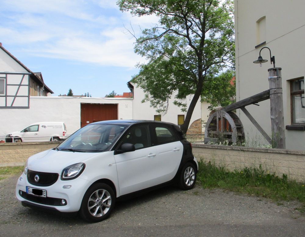 Vor der Mühle stand das Wasserrad still. Aber ein Auto mit ungewöhnlichem Antrieb stand davor.
