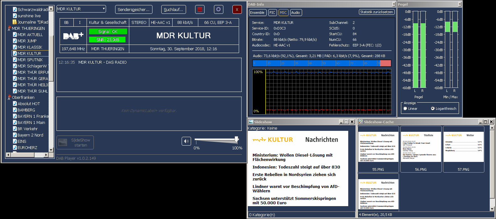 Letztlich ist das alles nur für Freaks. DAB klingt, so wie es real abgefeiert wird, fast immer scheiße wie ein Diktiergerät, weil die Bitraten viel zu niedrig sind und der Codec radikal ist (künstlich erzeugte Höhen). Letztlich sind von den hier genannten Programmen gerade mal BR Klassik klanglich sehr gut, BR Heimat gut, DLF Kultur noch gut, DLF und DLF Nova noch erträglich. Der Rest ist fast durchgängig klanglicher Murks. Besser, ihr bleibt auf UKW (solange es noch geht) oder, wenn das Wunschprogramm nicht dabei ist, nutzt ihr DVB-C.