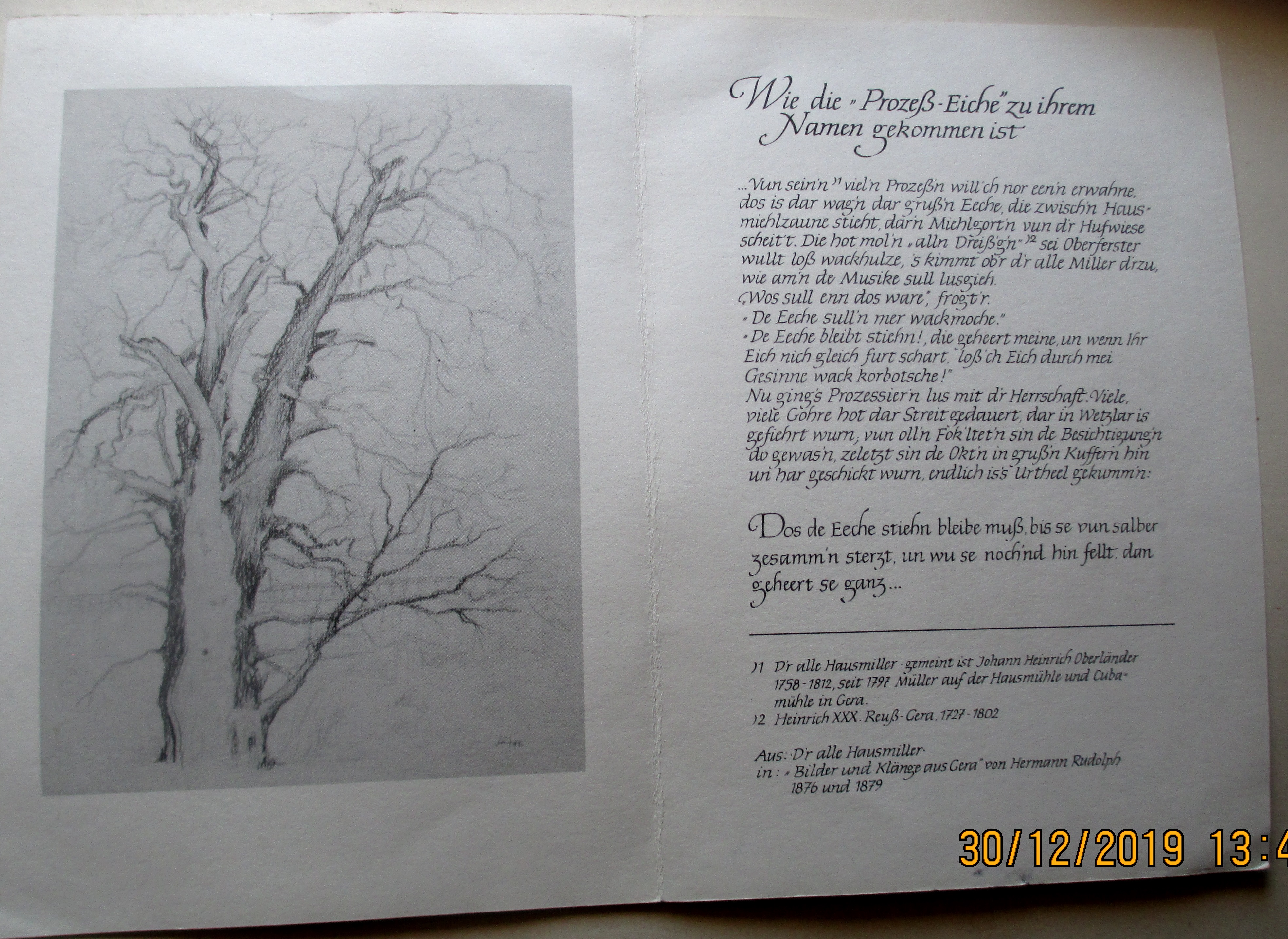 Ein vierseitiges Blatt mit Abbildung und der Geschichte, wie die Eiche zu ihrem Namen gekommen ist.